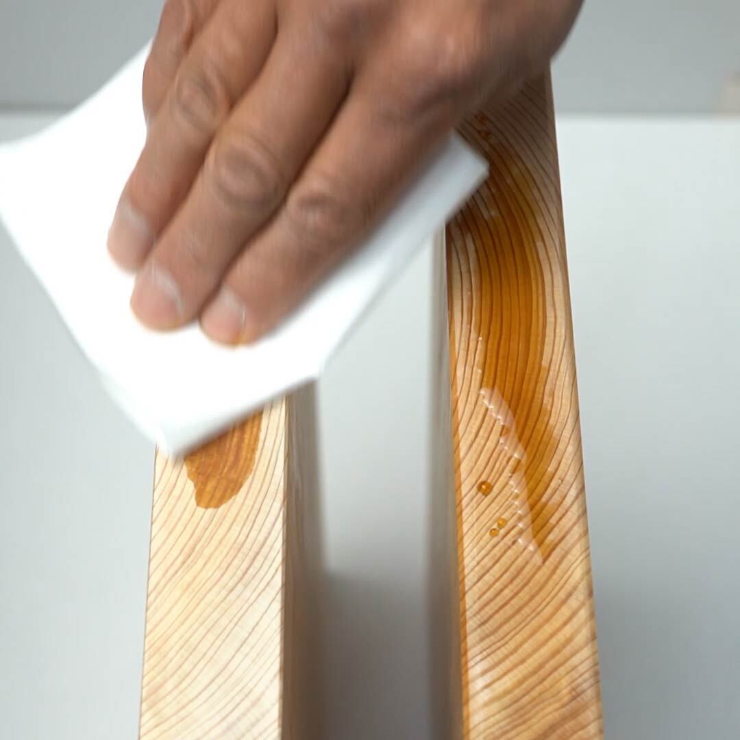 家具工房から生まれた木のための塗料「tatara撥水セラミック」は、表面に塗膜を作るウレタンやニスなどとは違い、高い浸透性をもって木の繊維奥深くまで染み込んで硬化する塗料であるため、木肌の自然な表情や質感、木の呼吸をそこないません。